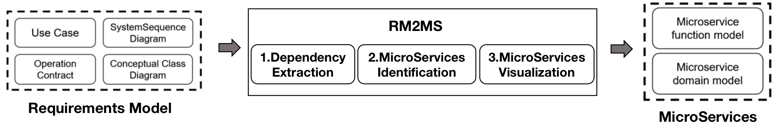 RM2MS introduce the concept of bounded context on the usecase model and concept class diagram aiming to present the decomposition of system functions and system database separately. In addition, provide-interface and receive-interface are defined on the domain context boundary to represent microservices interface information. RM2MS converts the microservices architecture solution to microservices design model, which contains two parts: