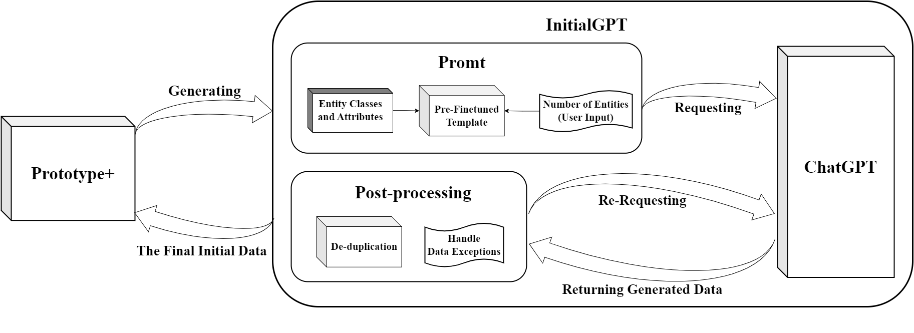 Automatic data generation and post-processing: We design a method to cope with the limitations of api request length and request number of LLMs, and perform data cleansing and re-generation by setting up post-processing rules to ensure that a large amount of reasonable initial data is generated without duplication.