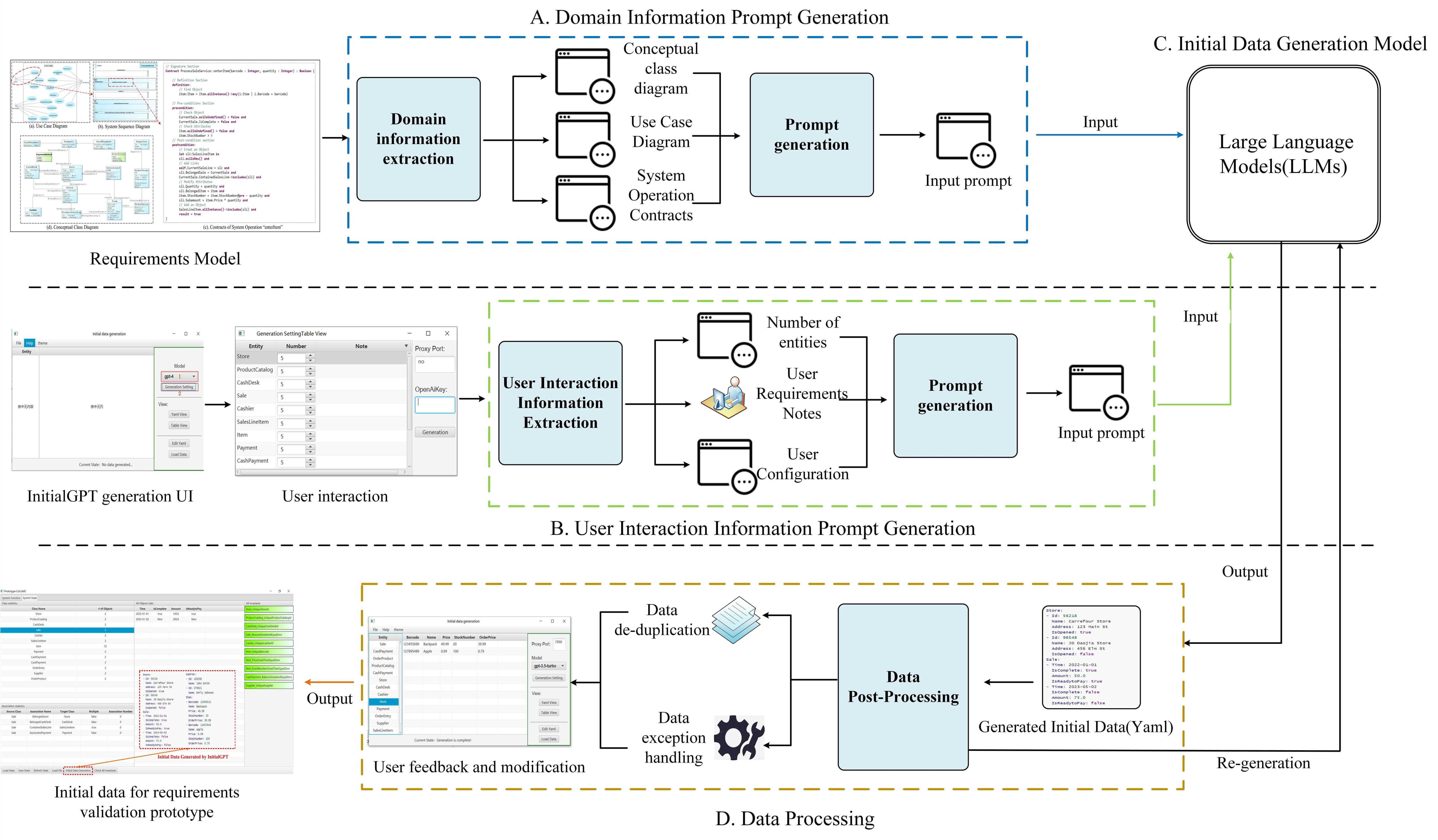 Automatic initial data generation of prototypes. The enhanced prototypes can automatically generate large amounts of prototype initial data for requirements validation via a large language model.