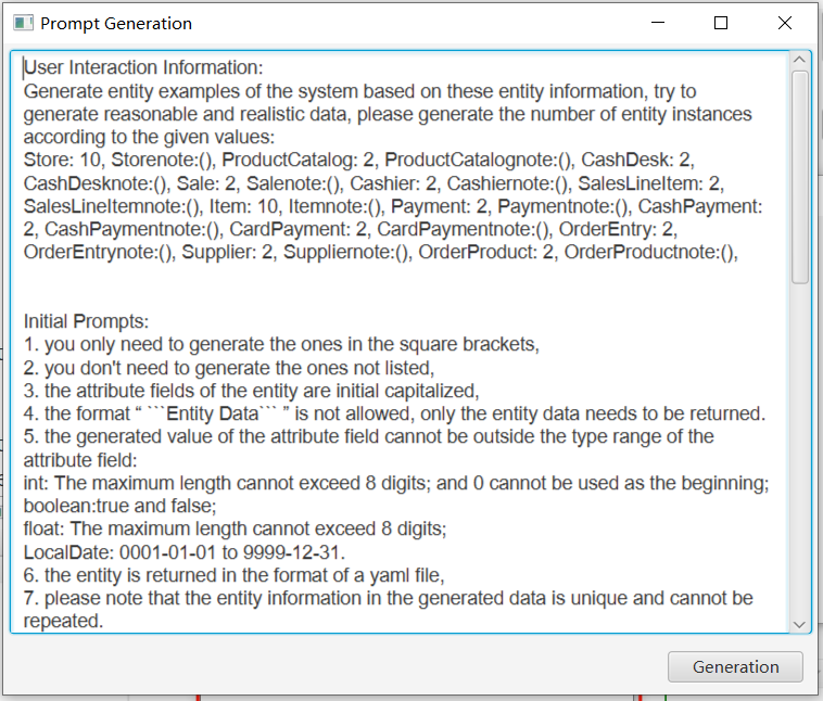 The Large Data Amount Prompt Template is similar to the General Prompt Template, but is generated for a single entity, 40 at one time, and post-processed until the final required number is fully generated.